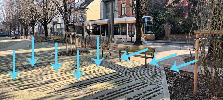 Het water van de straat, het voetpad en het plein infiltreert via de grasmatten, de bloemperken en de boomkuilen.